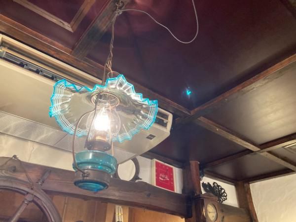 そして見上げて…目を奪われたのがこちらのランプ。可憐な形、透明感あるブルー。なんて素敵!と感動していたのですが、(あとで店主さんからお聞きして…)このランプは北海道の北一硝子さんで作られた手吹きのもの。店主さんのお父様である先代は、創業するにあたり、まずこれらのランプを付けたいという意志からお店作りされていったそうです。その思いが今も生きてるからこそ、照明が映えているのですね。