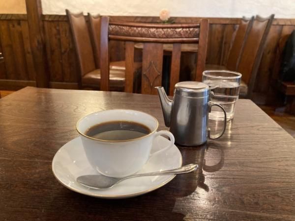 お願いしたブレンドです。クラシカルなインテリアに似合って、絵になります。 香り高くて濃い目の味。それでいて優しい。伝統の『立吉の珈琲』を味わうひととき。