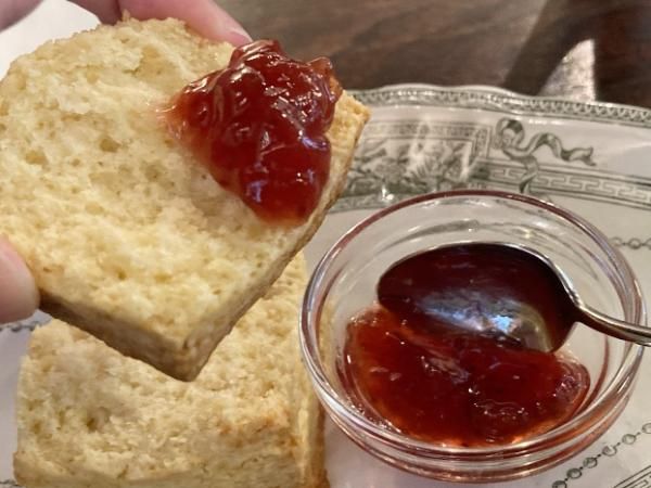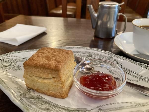 そして、楽しみにしていたスコーンが来ました。本日はスコーンが3種用意されていて、プレーン&苺ジャム、バタースコッチ、林檎とクルミ がありましたが、今回はプレーンでの注文。