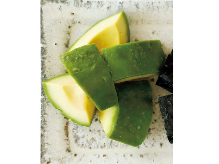 アボカド1/2個は種を取って皮をむく。みそ小さじ1を用意し、くぼみの部分に薄く塗る。残りのみそをラップに薄く広げるようにして塗り、アボカドを切り口を上にしてのせてやさしく包む。