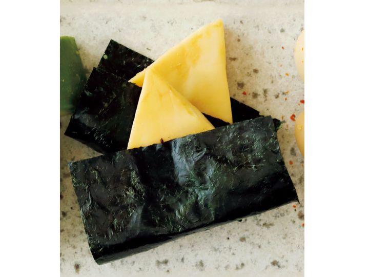 ラップにみそ小さじ1/2を薄く広げるようにして塗り、プロセスチーズ(個包装・20g)4個をのせる。みそ小さじ1/2をのせてぴったりとラップで包む。食べるときは好みで焼きのり適宜で巻いて。