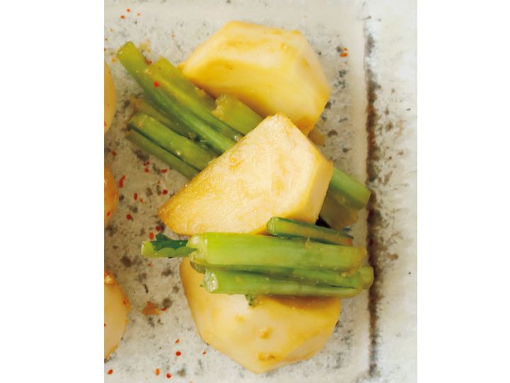 かぶ2個(約110g)は葉を切り分ける。身は皮をむいて一口大のくし形に切り、葉は長さ3cmに切る。保存袋に、かぶの身と葉、みそ小さじ2を入れてかるくもみ、袋の空気を抜いて口を閉じる。