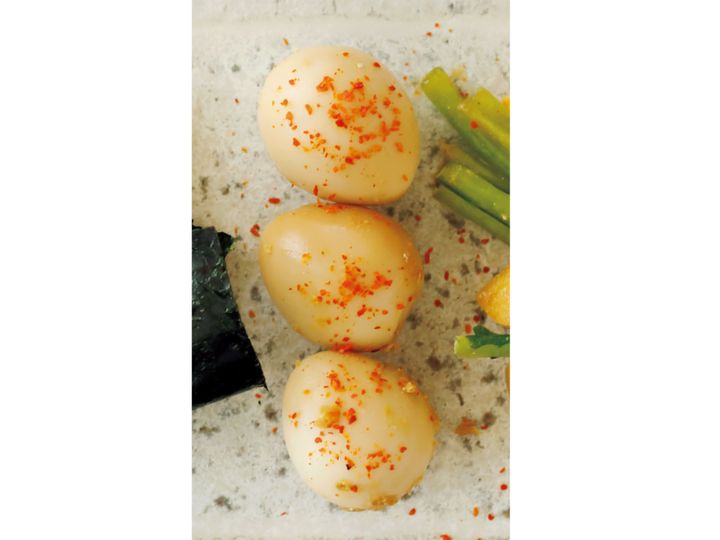 保存袋にうずらの卵の水煮6個、みそ小さじ1を入れ、卵をつぶさないようにかるくもんでなじませる。袋の空気を抜いて口を閉じる。食べるときは好みで一味唐辛子適宜をふる。