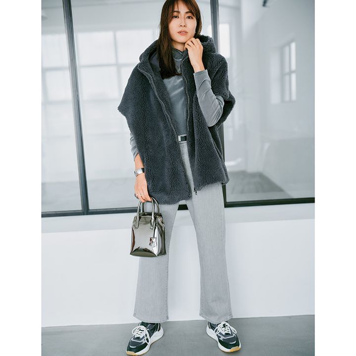 フワフワ質感のジレを羽織るだけで ワントーンがグッと華やかに。 グレーはグラデーションを意識して