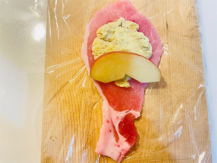 2.広げた肉に、1のさつまいもペーストを向こう1cm残してぬり、上にりんごをのせる。りんごが芯になるよう、手前から巻く。