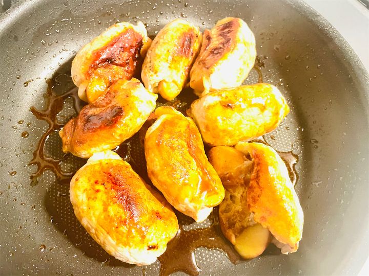 4.あらかじめ合わせておいた[A]を3に入れ、照りが出るまで煮詰める。タレを絡めたら出来上がり。