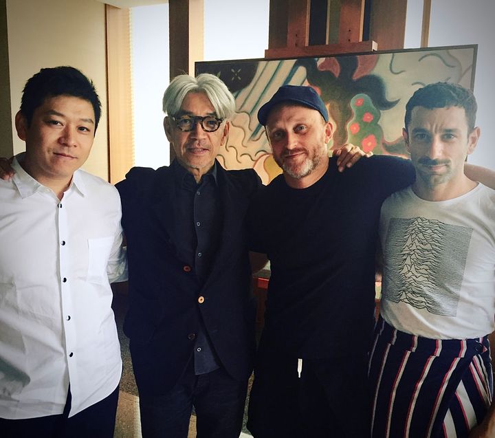 名和が振付家/ダンサーのダミアン・ジャレ、ダンサーのエミリオス・アラポグルと共に坂本を訪ねた会合後。2017年、東京。Courtesy of Sandwich Inc.