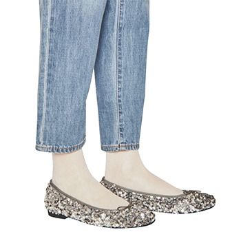 スパンコールフラットパンプス/アルテミス by ダイアナ(アルテミス by ダイアナ アーバンドック ららぽーと豊洲店) ソックス/17℃(17℃ by Blondoll 横浜ジョイナス店) デニムパンツ/コレックス(アバハウスインターナショナル オンラインストア) スパンコールのきらめきとドライなボトムとの間をつなぐ、シアーな白ソックス。おかげで靴だけ浮くことなく、キレイを獲得できる。