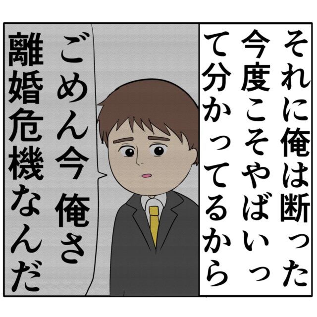 めいさんに隠し事をしてしまったろみ緒さんですが、「俺は断った。今度こそやばいって分かってるから」と自分を正当化。ろみ緒さんは会いに来たジュリ実さんに「ごめん。今俺さ離婚危機なんだ」と事情を説明していました。