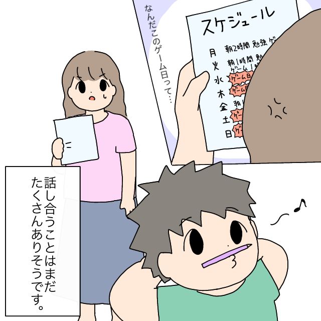 そしてスケジュールを見ると、「月:朝2時間、火:朝1時間、水:ゲーム・・木:ゲーム・・ん?土、日もゲーム??・・なんだこのゲームの日って・・」と頭をヒネる翠さん。どうやら話し合うことは、まだまだたくさんありそうです。