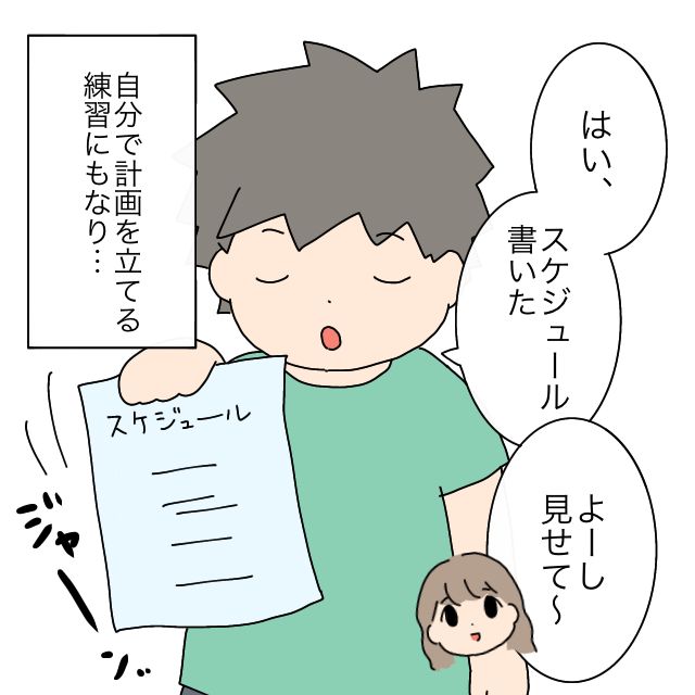 そして、「はい、スケジュール書いた」とスケジュールを差し出すタクくんに「よーし見せて~」と翠さん。タクくんが自分で計画を立てる練習にもなっているのでした。