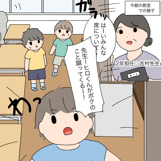 「はーい、みんな席について」吉村先生が教室に入って声を掛けると、「先生!ヒロ君がボクのこと蹴ってくるー!」マモル君が言いました。