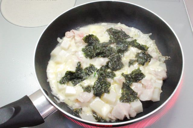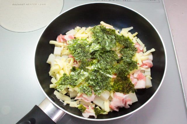 3. 点火前のフッ素樹脂加工のフライパンに2のお餅と豚肉、チーズを入れます。全体を混ぜながら丸く広げ、2ののりを乗せます。