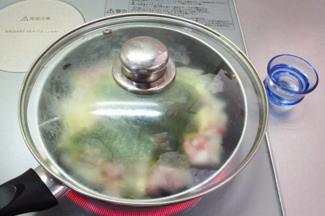 4. フタをして中火で5分ほど蒸し焼きにし、底面が焼けてきたら途中で水を注ぎます。