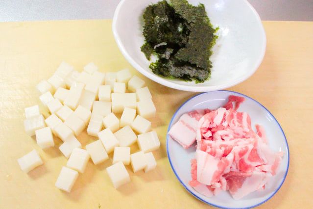 2. お餅を1cm角に、豚バラ肉を約1cm幅に切ります。のりは、手で適当な大きさにちぎります。