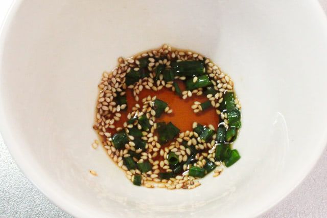 1. 酢、しょうゆ、白ゴマ、青ねぎを混ぜ合わせて、たれを作ります。