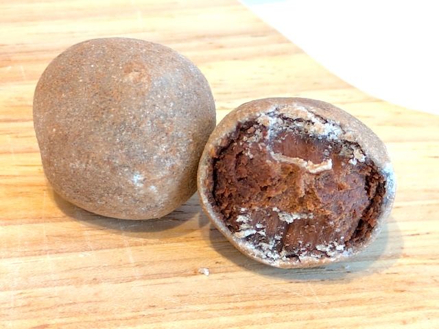 こちらは「琥珀ガナッシュ カカオ」。驚いたのは、薄氷のようなコーティングの繊細な食感。中のガナッシュは、やわらかくてなめらかです。