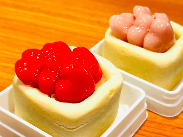 新潟の老舗和菓子店「越乃雪本舗大和屋」。ハートがのった上生菓子は、まるでケーキと見紛うビジュアル。ピンクのハートは「カカオの果汁チョコレート」、赤いハートは「ナッティカカオ」をそれぞれ使っています。白い餡の枡の中に、チョコレート餡が入った和菓子です。
