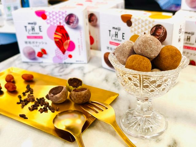 今回の目玉は「明治 ザ・カカオ 琥珀ガナッシュ」。上品なパッケージは京都のテキスタイルブランド「プティ・タ・プティ」とのコラボです。最近人気の琥珀糖からヒントを得た琥珀ガナッシュは、しっとりとしたガナッシュにシャリっとしたコーティングを施した全く新しいチョコレート。