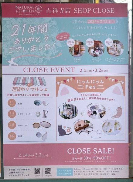 NATURAL KITCHEN & 吉祥寺店が、3/2(日)をもって閉店することが発表されました。