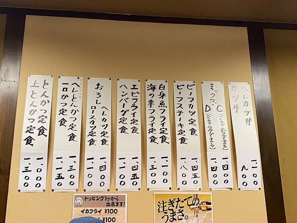壁にあるメニューはものすっごく悩みます。とんかつ・ヘレとんかつ・おろしロースカツなどとんかつでも悩みますし、エビフライだのビーフカツだの。 ずいぶん悩みましたが初志貫徹でとんかつ定食(1000円)にしました。