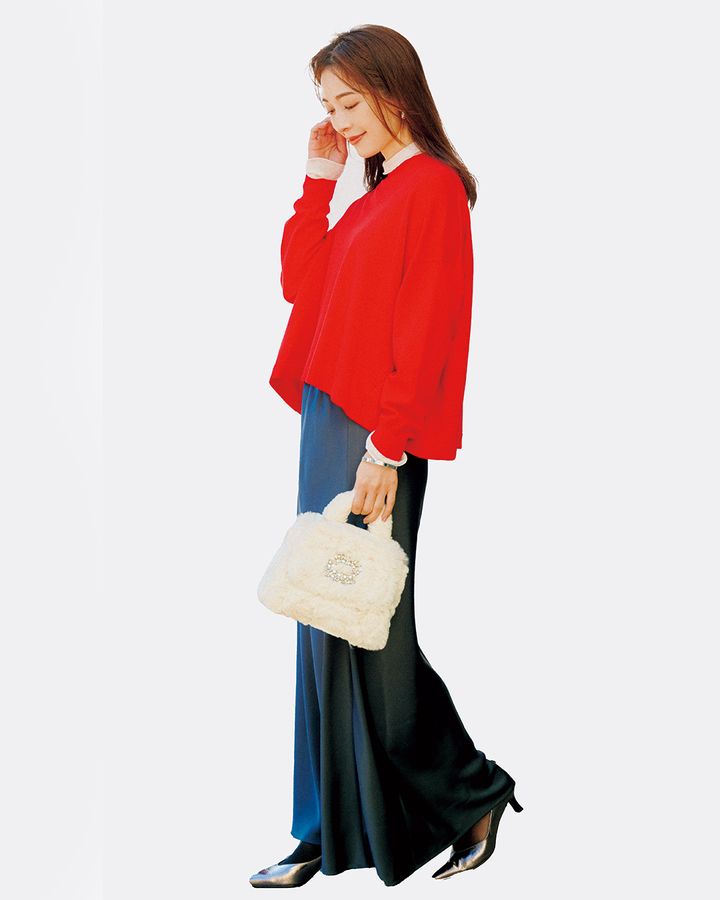 <写真2枚目>スカートは色違い。ニット¥20,900(マイカ アンド ディール/マイカ アンド ディール 恵比寿店)タートルネックニット¥26,400(バーニーズ ニューヨーク)バッグ¥17,050パンプス¥18,150(ともにダイアナ/ダイアナ銀座本店)ピアス¥11,550(ココシュニック オンキッチュ/ココシュニック)バングル¥12, 100(ワンエーアールバイウノアエレ/ウノアエレ ジャパン)