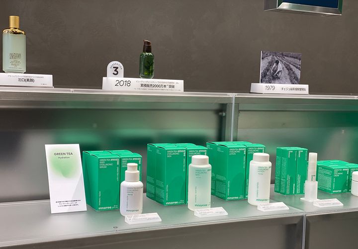 ベルトコンベア型のディスプレイでは、「INNISFREE」のこれまでの歴史と記録を見渡せる。