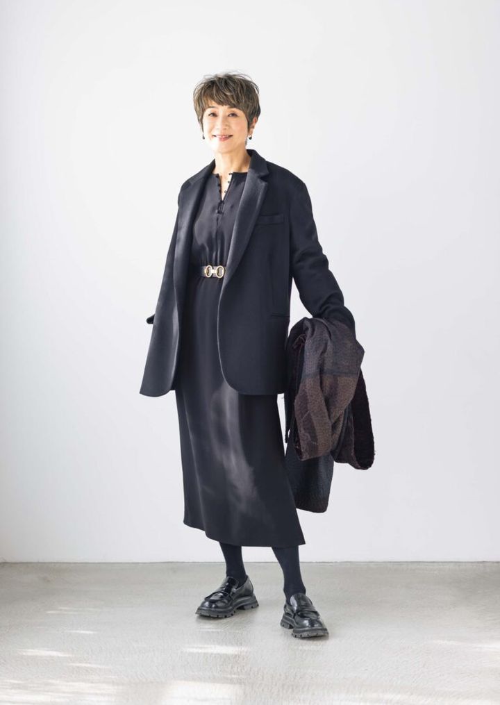 「移動は車がメインなので、アウターはショート丈のものが多いです。『シンメ』のカシミアジャケットは、大きめのシルエットでカーディガン感覚で使えて便利です」。ワンピースは自身のブランド「ニュイ ノワール」、ワンポイントとして目を引くベルトは「エルメス」。