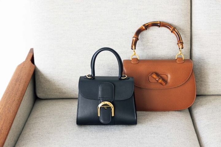 「置いて自立するキリッとした佇まいのワンハンドルバッグは、年中無休です」。ブラウンは『グッチ』、黒は『デルヴォー』のもの。
