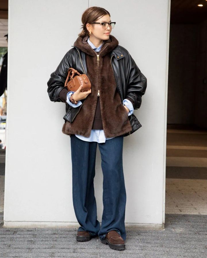 ブラックのレザージャケット、ブラウンのファーベストとニットと、シックな色あいの重ね着にもかかわらず重く見えないのは、中に重ねたライトブルーのシャツのおかげ。同トーンのデニムとはもちろん、ブラックやブラウンとも相性のよいライトブルーのシャツは使える!