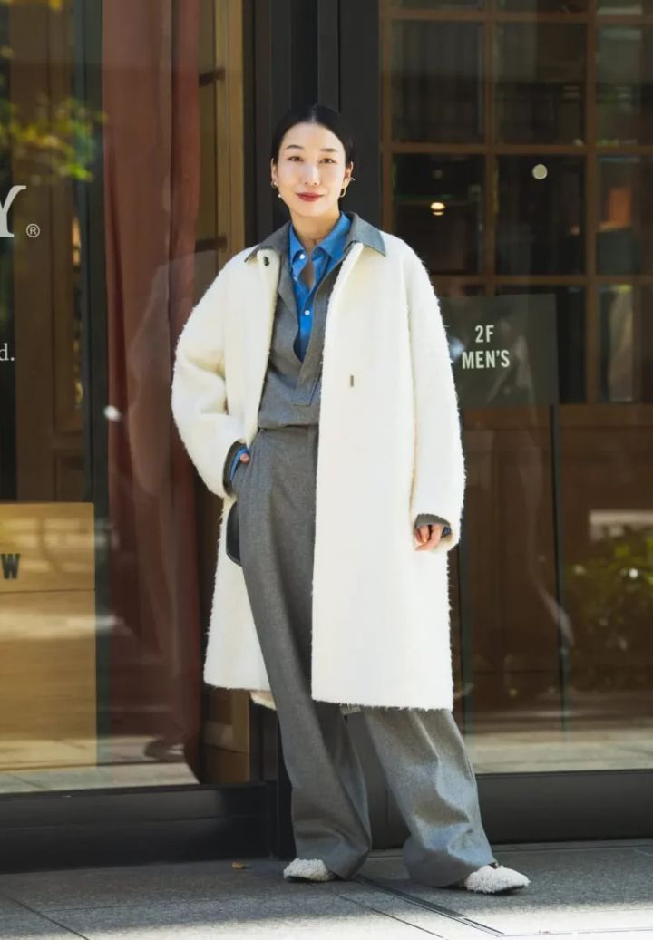 ハンサムなウールのセットアップの首元から、鮮やかなブルーを覗かせた洒落感たっぷりのレイヤードスタイル。この冬注目のシャツ×シャツの重ね着は、ぜひ取り入れたいテクニックです。ホワイトのコートとも相まって一層華やかな印象に。