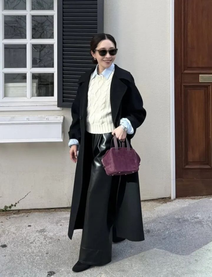 滑らかな質感の上質コートに艶やかなレザーパンツ、一見クールすぎる印象になりがちな組み合わせを、ケーブルニットを合わせることでヌケ感を演出しているのはさすが。さらにインナーにブルーのシャツを入れて、クリーン&トラッドなムードに。