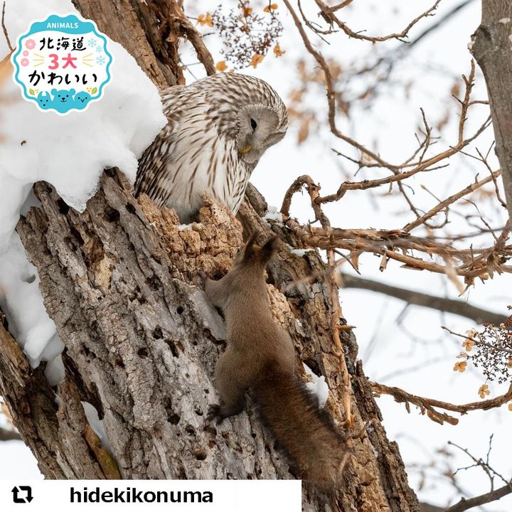 エゾフクロウとエゾリスの、ニアミス!?「エゾリスが食べられちゃう!」って思った方、ある意味、正解です。