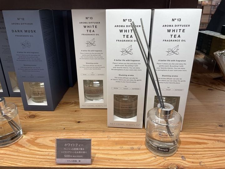 香りの種類も豊富で、ホワイトティーをはじめ、ダークムスク、サボン、エレガントローズ、リリー&ジャスミンなど十数種類。プチプラだから、お部屋ごとに香りを変えるなんて贅沢な使い方も!