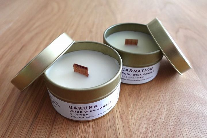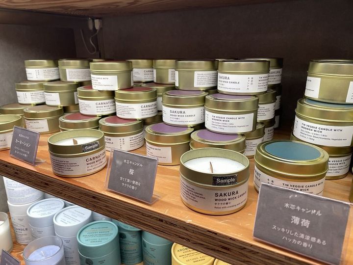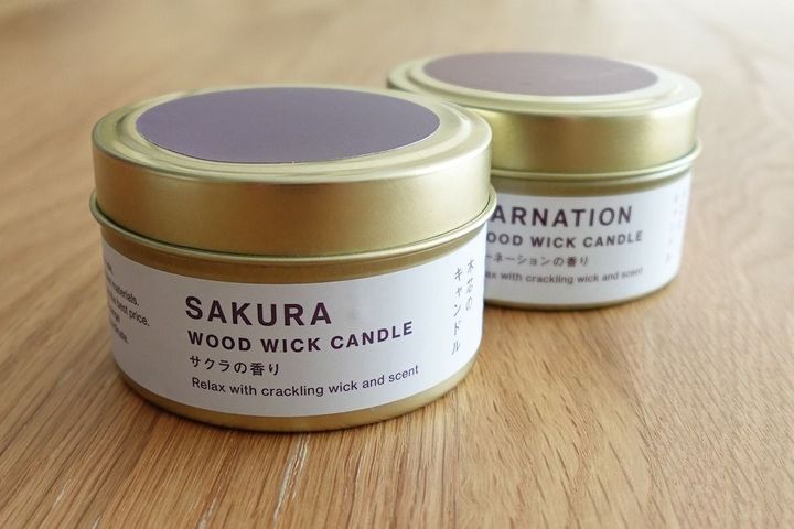 こちらは缶に入ったキャンドル(木芯)。桜、カーネーション、バニラ、ペパーミントなど香りのバリエーションがあるアロマキャンドルです。