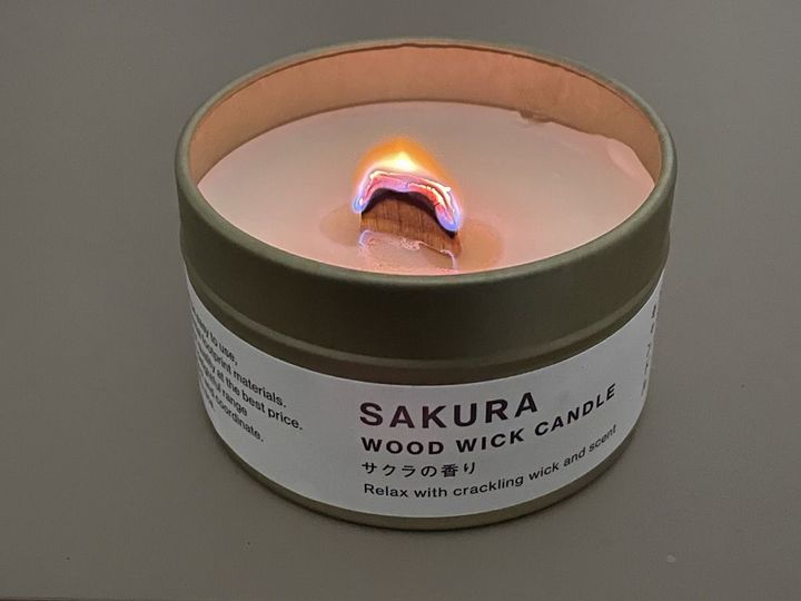 火を点けてみます。すぐにパチパチとした音がしてきて、木芯周りの蝋が溶けてくると、桜の香りがやさしく漂います。