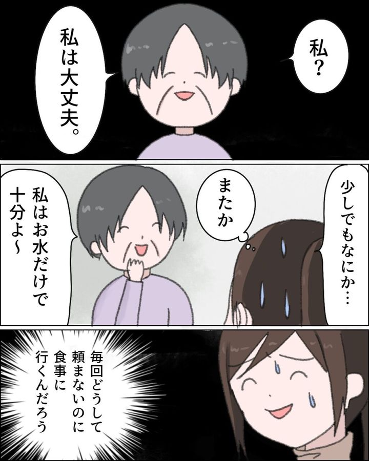 「私は大丈夫。」と義母は言いました。「少しでもなにか」と言っても「お水だけで十分よ~」とニコニコしています。「またか」と心の中で焦りました。毎回どうして頼まないのに食事に行くんだろう。何も食べずにお水だけもらうなんて。