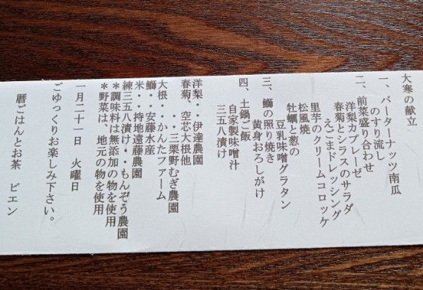 食材の仕入れ農家さんや店舗まで記載があります。 お気付きでしょうか⁈写真右側に大寒の献立と書かれています。店名にもあるようにbienは暦ごはんを大事に考えて献立を作っていらっしゃいます。季節ごとの食文化を大事に捉え、季節のものを提供。加えて無添加調味料・地元野菜・果物・米を選んで調理と、安全で良い食べ物を提供することを心がけていらっしゃいます。近くでこのような食事が出来るのはありがたいですね。