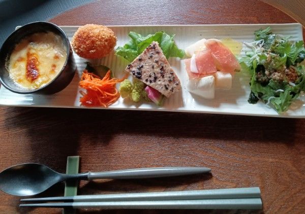 右から…春菊とシラスのサラダ、ドレッシングはえごまドレッシング・洋梨カプレーゼ・松風焼き・里芋のクリームコロッケ・牡蠣と葱の豆乳味噌グラタンという豪華な内容です。