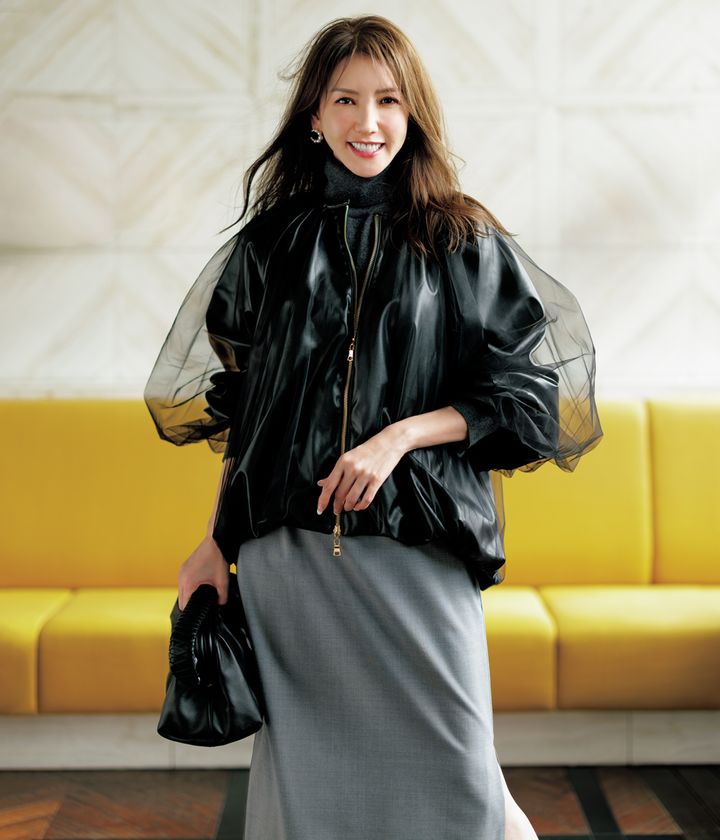 旬のチュールとフェイクレザーを合わせた意外性のあるブルゾンは冬コーデのマンネリ打破に最適。丸みのあるシルエットにボリューム袖、ゴールドのダブルジップと高見え要素満載で羽織るだけで着こなしが華やかに。
