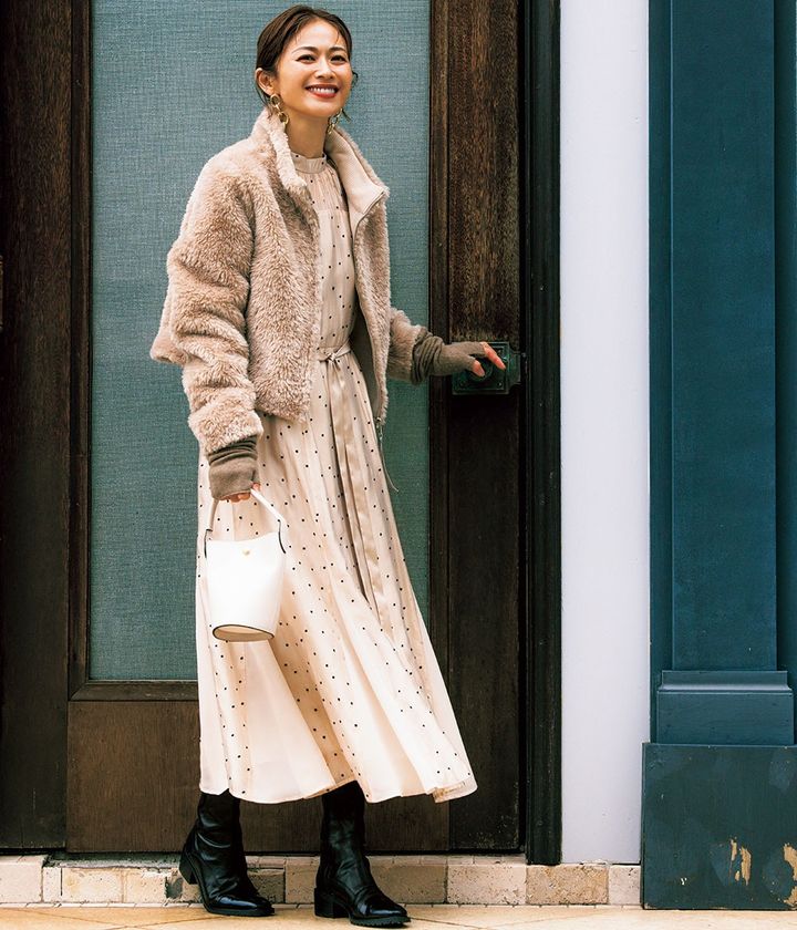 《写真3枚目》ダウンジャケット(ブルゾン着回し)¥88,000(デュノ)ワンピース¥26,400(ジャスグリッティー/ジャスグリッティー プレスルーム)グローブ¥23,100(フィーニー)バッグ¥60,500(ロンシャン/ロンシャン・ジャパン)ブーツ¥59,400(ツル バイ マリコ オイカワ)ピアス¥18,360(アビステ)