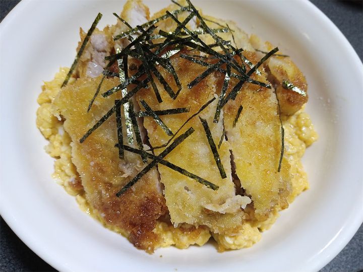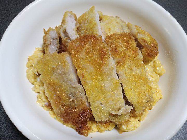 5.丼にご飯をよそい、4の卵をのせる。その上に3のカツをのせたら完成。