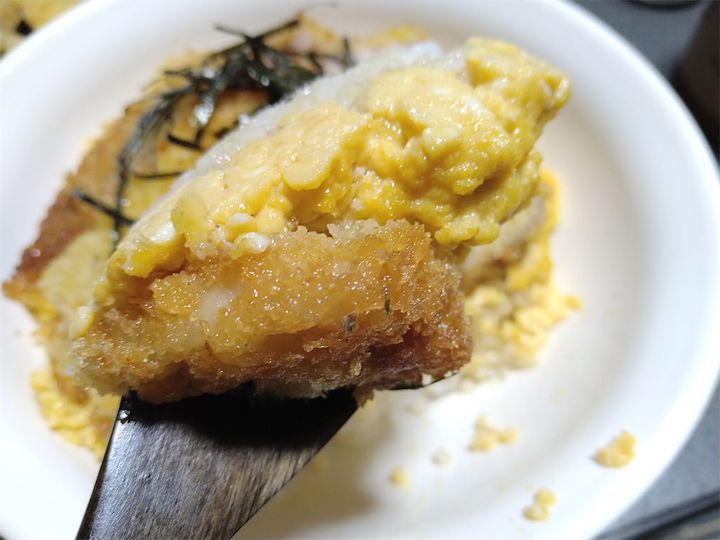 ご飯と一緒に口に運べば、サクサク衣のカツと、トロトロの卵を同時に味わうことができますよ。いつもと違うのは、卵を上にかけるか下に敷くかの違いだけ!