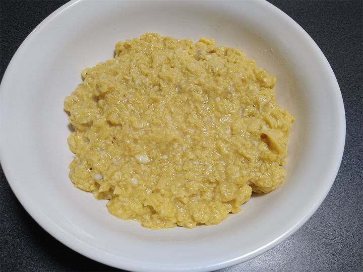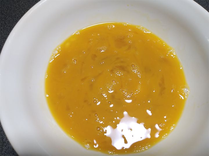 4.ボウルに卵とめんつゆを入れてよく混ぜたら、熱したフライパンに流し入れる。菜箸で混ぜながら半熟加減で火を止める。