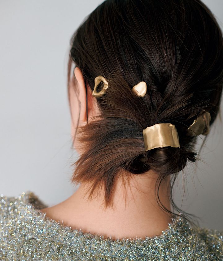ヘアミルクとワックスを混ぜたものを全体につけ、ベースはしっとりした状態に。ゆるく三つ編みをし毛先を長めに残した状態でラフにゴムでシニヨンを。ゴムを隠すようにヘアピアスを、正面から見えない位置に飾りピンをランダムにつけたら完成!(paku☆chan)