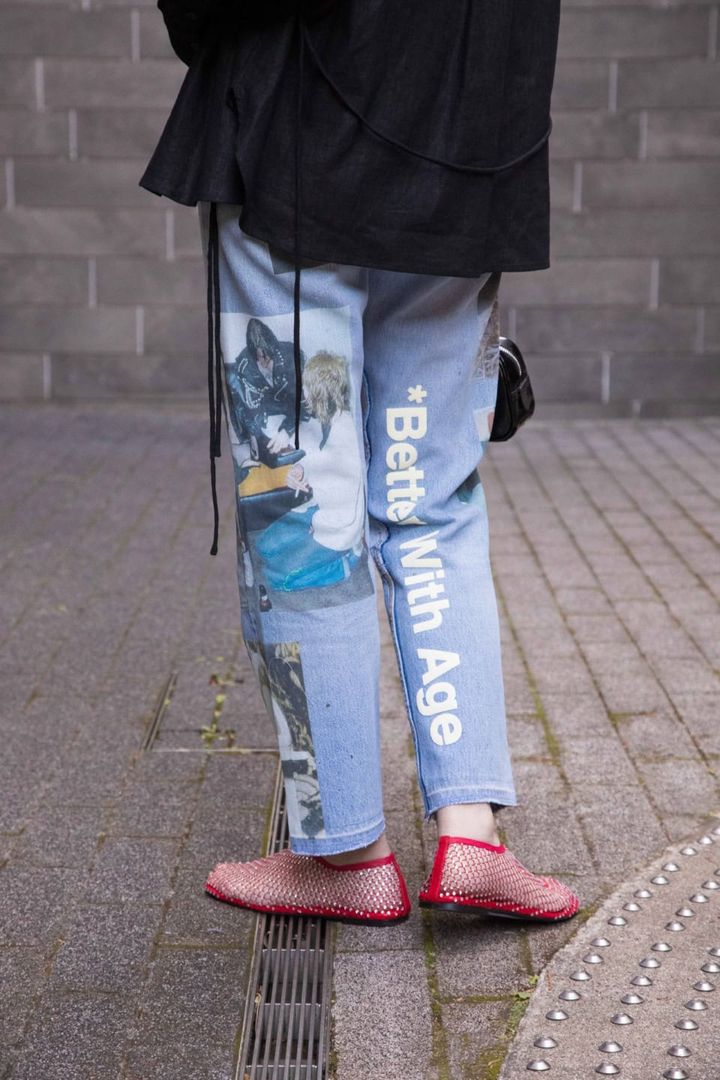 「前も後ろもグルッとプリントがあしらわれているデニムなら、シャツとデニムの王道コーデも個性的に! 足元にはメッシュのフラットシューズを合わせて、女性らしいモードさをプラスしています」パンツ¥115,500(ベター ウィズ エイジ)、シューズ¥20,900(モリーニ/共にシティショップ )
