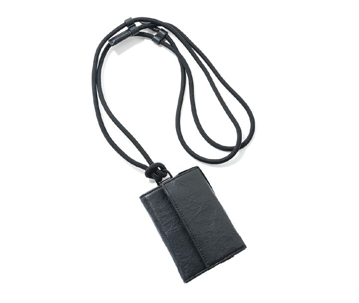 鍵用ポケットとカードホルダー、札入れと小銭入れを備え、小ぶりながら収納が充実。しわ加工を施したレザーの独特な表情もポイント。