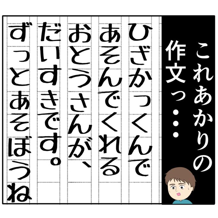 「これあかりの作文っ・・」めいさんが差し出したあかりちゃんの作文には、「ひざかっくんであそんでくれるおとうさんが、だいすきです。ずっとあそぼうね」と書かれていました。