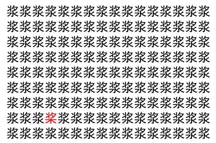 画像の中には、「浆」という漢字が縦に9行、横に16個並んでいます。 全部で144個となりますが・・・、そのうち1つは「異なる漢字」となってますよ!!