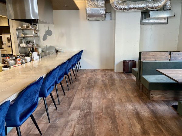 入口近くのバーカウンターのほか、奥には低めで広いカウンター席もあります。